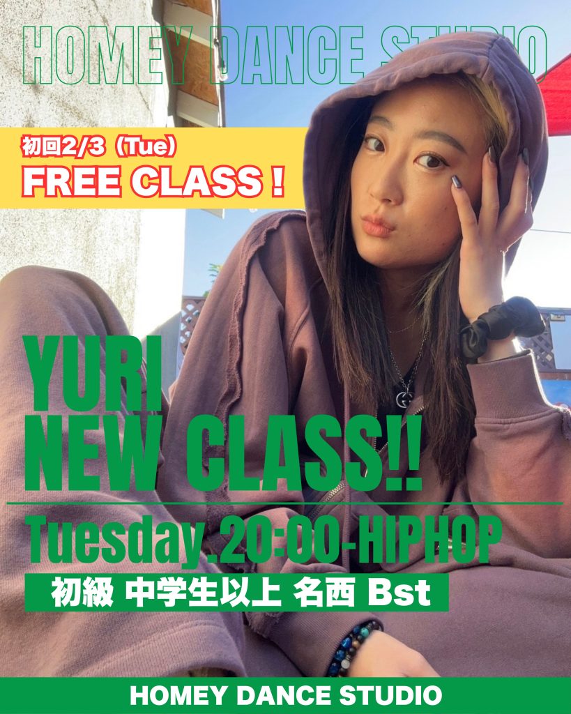 📢 NEW CLASS START 2月より、名西校に YURI先生の中学生以上対象のHIPHOPクラスが登場! さらに‼︎ 初回レッスン日の2/3(火)は誰でも¥0で受講可能👀✨ YURI先生のクラスさ基礎からしっかり丁寧に、楽しく学べるクラスです☺️ ⸻ 🕺 Class Info Instructor:YURI 日時:毎週火曜 20:00〜 ジャンル:HIPHOP 初級 対象:中学生以上