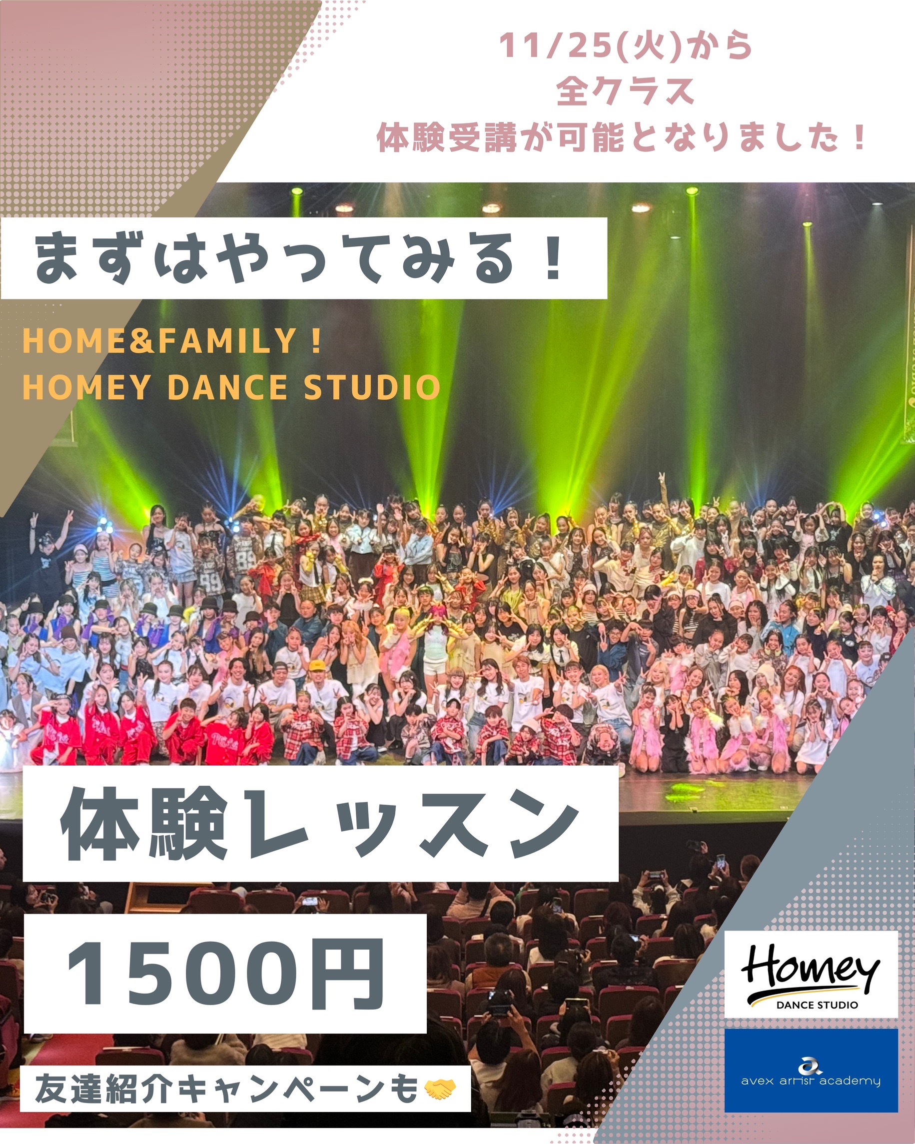 HOMEY DANCE STUDIOでは、初心者から経験者まで、2歳から18歳以上対象の大人の為のクラスまで、安心してご参加いただけるクラスを多数開講しています。