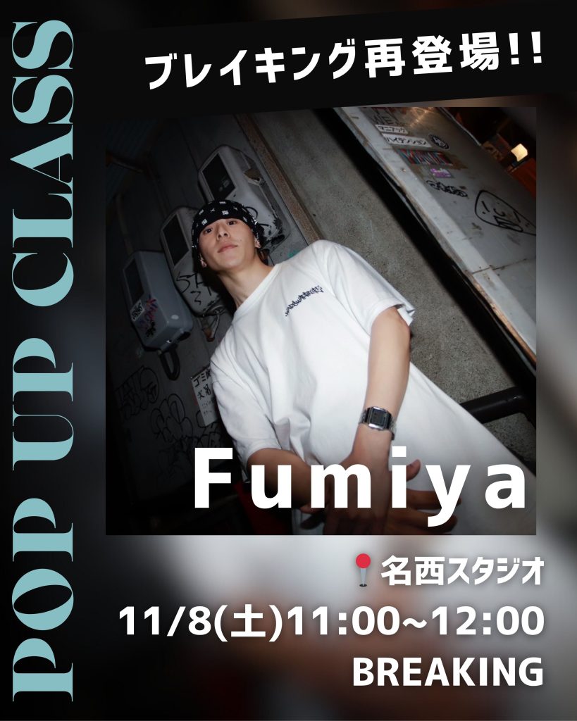 ✨POP UP CLASS ✨ 前回大好評だったブレイキングクラスが、再登場! 「前回はスケジュールが合わず参加できなかった…」 「動画を見て挑戦したくなった!」 「自分にもできるかも!」 そんな方は、このチャンスをお見逃しなく🤸✨ もちろん!前回ご参加いただいた方の再チャレンジも大歓迎🔥 パワフルで自由なブレイキングの世界を、ぜひ一緒に楽しみましょう! __________________ 【Instructor】 Fumiya 数々のコンテストで受賞し、なんとニューヨーク・アポロシアターでもダンスを披露した実力派 の先生です! 【日時】 11/8(土)11:00-12:00 📍名西スタジオ…