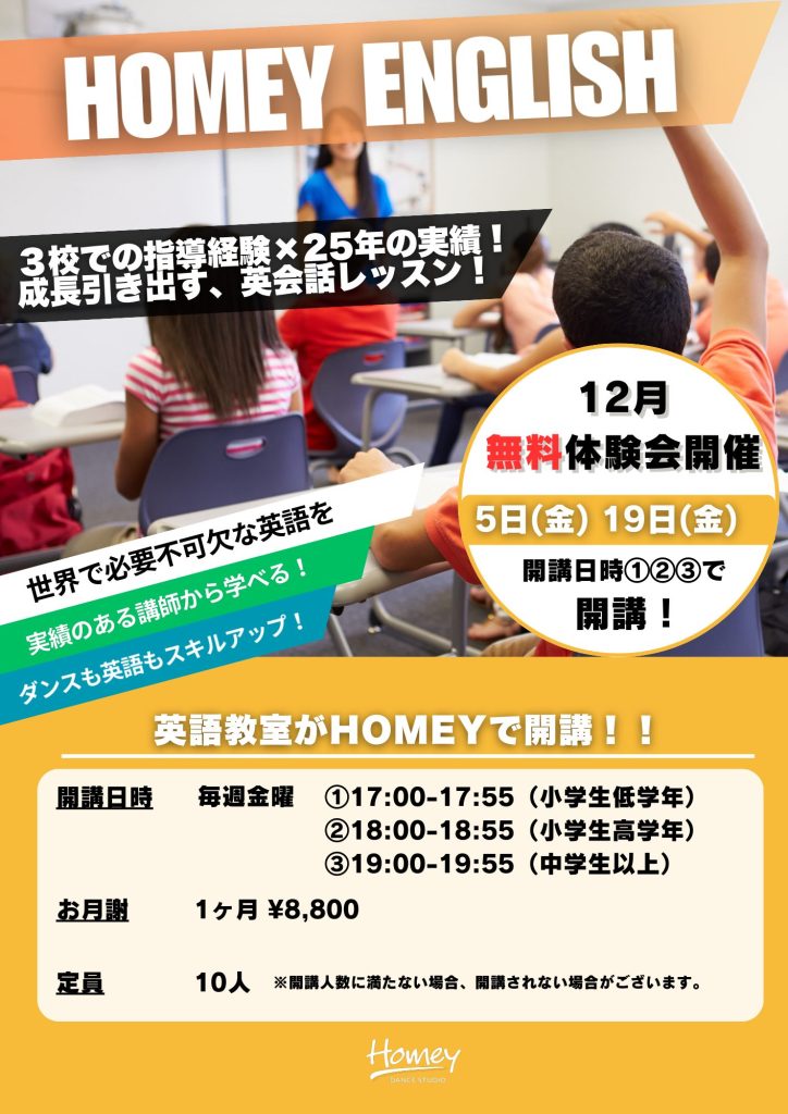 \HOMEY NEWS✨/ 【12月に英会話クラス無料体験会を開催🌍✈️】 📌 ダンスの世界はもちろん、日常生活でも英語が必要な場面がどんどん増えています。 これからの時代、「英語が話せる」ことは大きな武器となり、自信にもつながります✨ ⸻ ✅ こんな方におすすめ! ・英語に苦手意識がある… ・英語を話せるようになりたい! ・留学や海外も視野に入れている! まずは 体験レッスンで雰囲気を感じてみましょう😊 ⸻ 🕒 受講スケジュール例 ・17:00-17:55 英会話 ・18:00-19:00 ダンスレッスン ➡︎ 移動時間なしで、英語もダンスも両方できちゃう! もちろん、英会話のみの受講も可能…